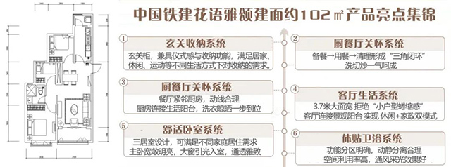 中国铁建花语雅颂建面约102㎡、106㎡产品,在同面积段户型中极具碾压性优势:全系全明户型,南北通透;LDKG一体化设计,在空间结构上独有一番见解,为极致而来。