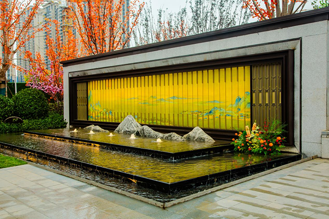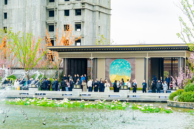 园林营造严格遵循宋式《营造法式》规制,精筑避风、擗帘杆、方格挂、钩窗阑槛、版引檐五大风雅宋韵设计,约40米宽府门以古铜色金属挑檐重现宋式灵动,门前 "四水归堂" 水景寓意吉祥,与雕塑 "如意芳华" 共同构成尊崇归家礼序,汲取《瑞鹤图》、《千里江山图》等美学元素,让每一处建筑细节都成为文化载体。