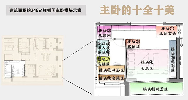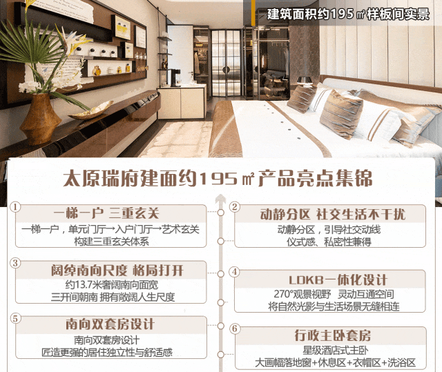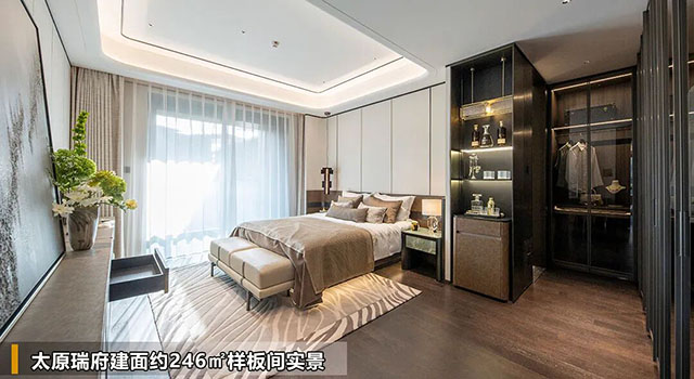 当然,除了公区的匠心细节之外,太原瑞府建面约246㎡产品还为业主贴心设计出近40m2近豪华主卧套房,十大场景模块,如同「墅中墅」,圈层享受放大N倍,更有家的温馨。