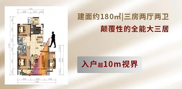 建面约180㎡户型因着小高层的高得房率,可媲美市面上超200㎡高层的空间感,是一个少花约20平米的费用就可实现满足三代人需求的绝版方案。