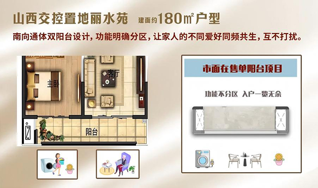 对于山西交控置地丽水苑来说,1个阳台是标配,2个阳台是自在,因为你不用担心请客人回家,它在客厅就看到你阳台晾晒的内衣。